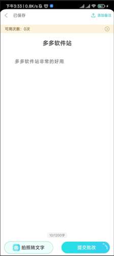 3、我们可以拍照直接转文本,也可以将写好的作文直接一键复制粘贴到app上,写好后点击提交批改。