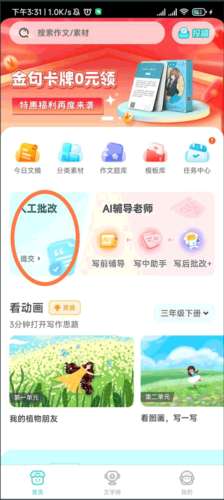1、首先我们先进入app中进入到主页就能看见人工批改的区域,我们点击它。