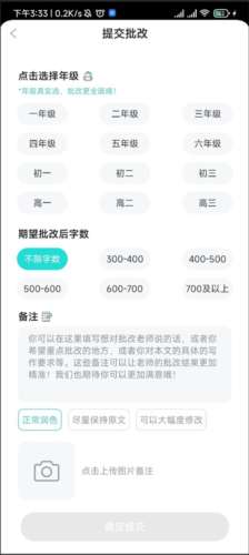 4、然后选择自己的年级已经期望批改后的字数,这些都填好后点击确定提交就会有老师线上进行批改了。