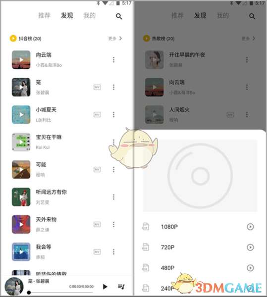 3、首页发现更是提供了300首热歌榜和抖音榜等多个榜单,每一首都独立标识MV可供下载。提供从240p到1080p清晰度选择。