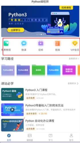 2、在“发现”模块中,有免费的python教程可以观看,还有python爬虫开发、前端开发、web开发可以使用。