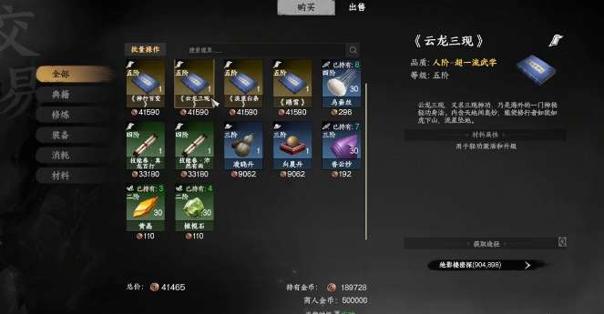 当主线剧情在推进之后,玩家具备基础的探索能力,就可以优先来到枰栌城,在这里就可以去获取云龙三现,在这座小城市玩家就能看绝影楼密探,在他的手中就会有很多的武功秘籍。并不需要去解锁特定的任务,只需要来到这里,然后在城中去搜索即可。双方在完成对话后马上就可以购买,不过由于这一个秘籍属于金色品质,售价相对比较高。玩家要想获取,那自然就需要通过多个方式去积累资金。部分支线任务奖励比较丰富,尤其是涉及到江湖恩怨的任务,就可以迅速的赚取银两。