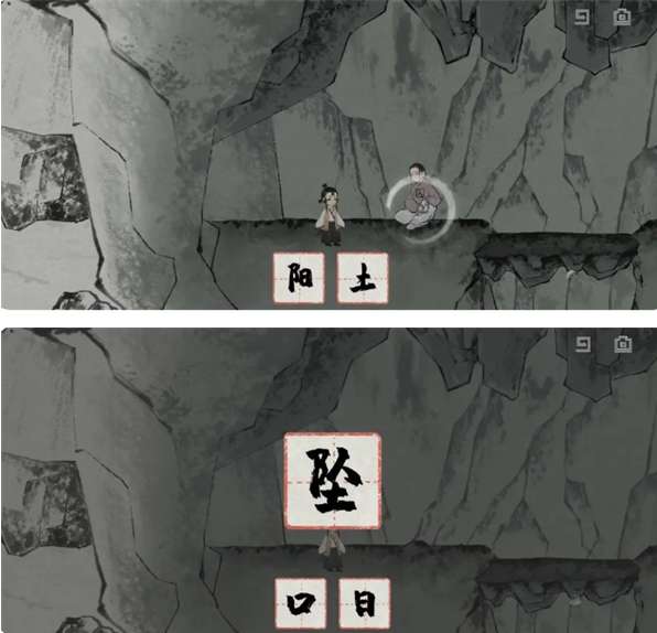 4、将“坠”字应用于石桥,触发机关后跳跃,继续探索。