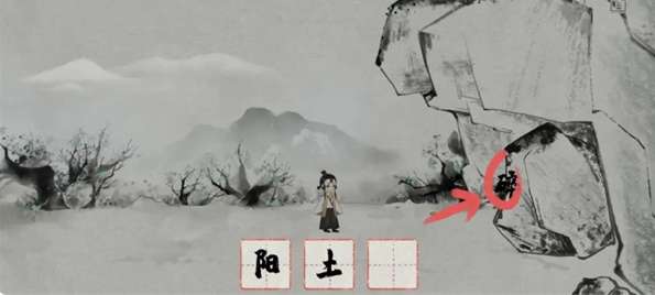 2、深入洞穴收集“囚”字,返回洞口左移至土堆,收集“土”字,抬头观察获取“阳”字。
