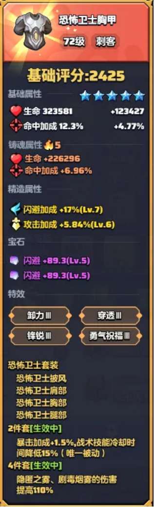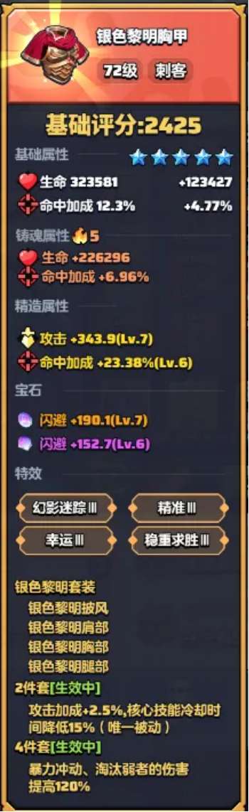例如:刺客70级的银色黎明套装,套装以百分比加成攻击为主,所以词条在选择的时候可以偏向更多的基础攻击加成;而同为70级的恐怖卫士套装,套装以暴击百分比加成,所以词条以暴击更多为主。