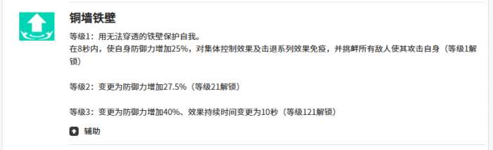 克洛伊的第二个技能叫做铜墙铁壁,使用这个技能的话,大概可以给她自身带来一定的保护效果,在每8秒时间之内,克罗伊就可以根据技能的效果为自身带来防御力上面25%的增加,而且对于气体控制当中的能力来说,她其实是可以对敌人释放的一些击退能力直接免疫的,所以在此时对面如果有此类角色的话,克罗伊根本就不用害怕,并且她可以挑衅所有的身上,让这类敌人的效果受到一部分的影响之后,就会快速的将攻击能力都释放到克洛伊的身上,所以放在前排算作是一个嘲讽拉伤害的效果。
