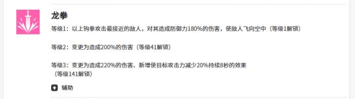 龙拳这个辅助技能对于克罗伊来说是一个主动攻击的能力,在其中带来攻击的动作是一个上勾拳,此时对敌人攻击根据她百分比来计算的话,是提取防御力当中180%的数值来进行伤害,此时敌人还有一定的概率会被克罗伊给击飞,后期就能在升级之后更好用,这里还可以让敌人攻击力减少20%,而在他的被动技能效果上面有一个不屈不挠的意志,这个技能可以根据目前克罗伊所在位置来进行触发,如果克鲁伊当前是敌人集火攻击的目标,那么此时她可以带来的这个能力就可以被动触发,让克罗伊在体力低于35%的时候,生效时间之内物理抵抗属性上面增加40%的属性之后,魔法抵抗同样也增加这个数值,然后再恢复体力上限7%的效果之后,克罗伊还可以带来足够的回能,当然这个回能效果虽然好用,就是一场战斗里面是只能用到一次的。、