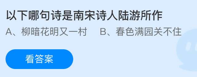 以下哪句诗是南宋诗人陆游所作?支付宝小鸡课堂新的一天答题开始啦!每天只需花一分钟,动动手指答对问题,180g饲料立马到账!2026年4月23日蚂蚁庄园的小鸡课堂题目正确答案是【柳暗花明又一村】,“柳暗花明又一村”出自南宋诗人陆游的《游山西村》。