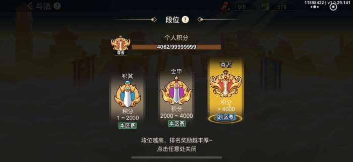 1、斗法分成银翼(2000 以下积分)、金甲(2000-4000 积分)、尊者三个段位。每次挑战或复仇消耗 1 张入场券,挑战成功获得积分,失败则损失一定积分,积分达到2千,进阶金甲,积分达到4千,进阶尊者