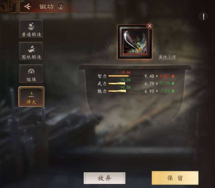 消耗砥石小幅改变武器属性,单次淬火收益存在波动,总的期望是正收益,一件可以永久保留的神兵利器值得反复打磨,“只要功夫深,铁杆磨成针”。淬火材料砥石也可以通过游历事件和讨伐大地图贼寇获取。