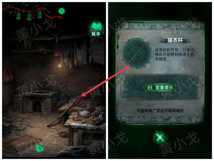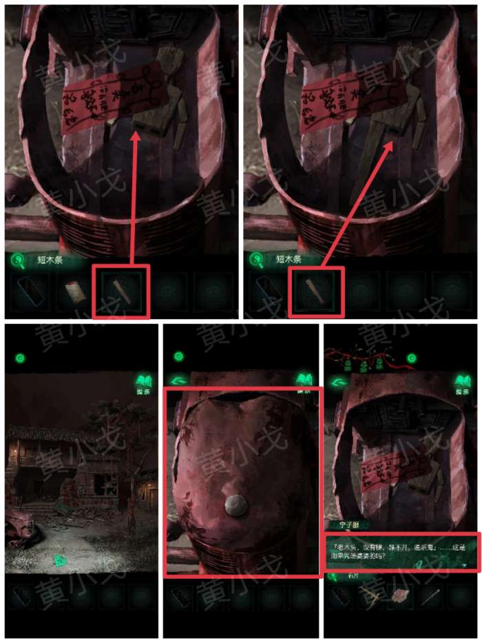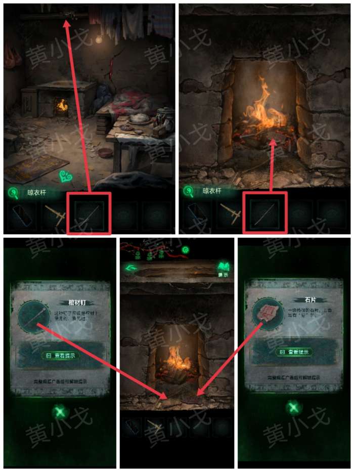 10.用【晾衣杆】把房梁上的布娃娃捅下来烧掉;再用【晾衣杆】把炉灶里的【石片】和【棺材钉】拿出来