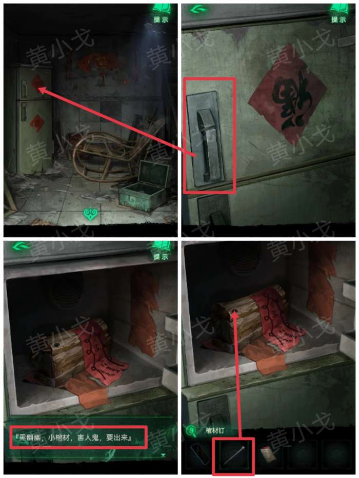 25.点击冰箱,打开,根据符上的文字,把【棺材钉】插入小棺材上的孔洞