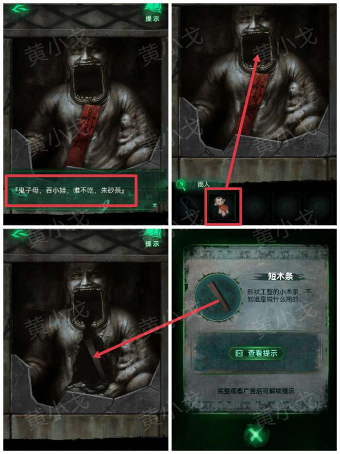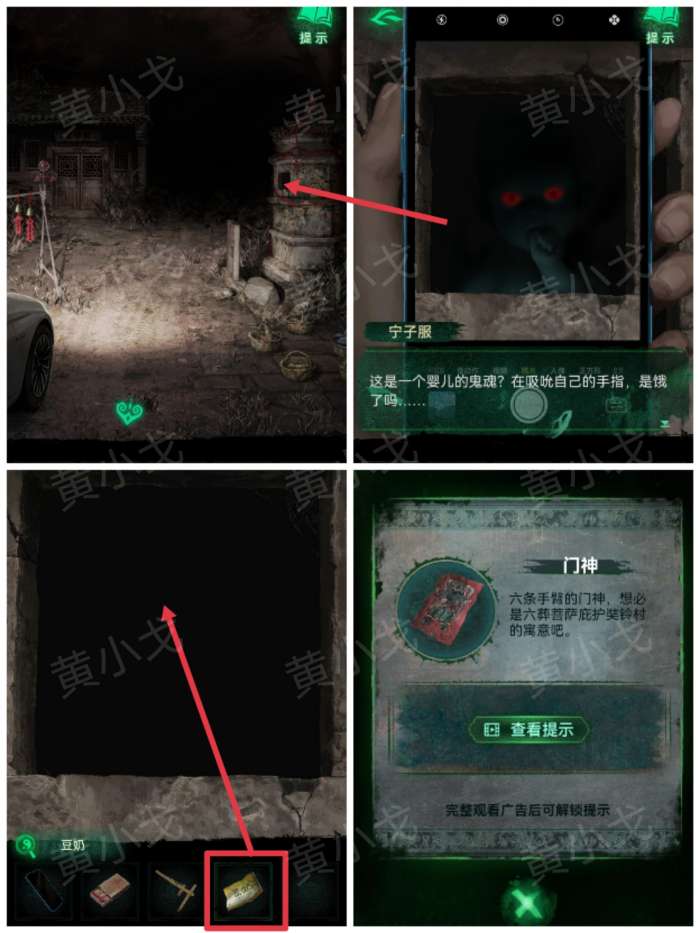 5.点击塔上的洞口,拿出手机,看到婴灵;拿【豆奶】给婴灵,获得【门神】