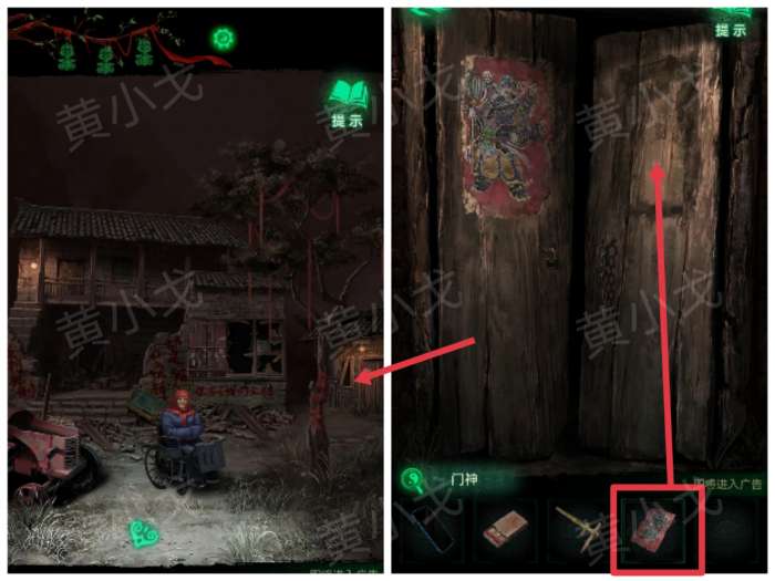 6.剧情过后,点击右侧房屋的门,贴上【门神】,打开门
