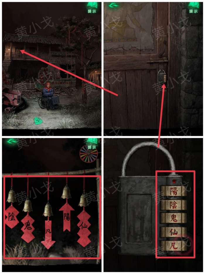 21.点击商店二楼房间门上的锁,根据上面的红点提示,结合祈福风铃上的字和红纸的形状,输入密码:阳阴鬼仙凡