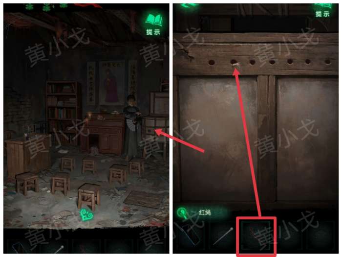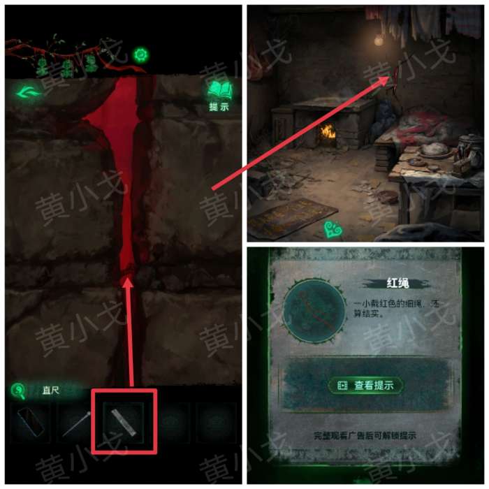 14.用【直尺】取出墙缝里的【红绳】(有小高能?)