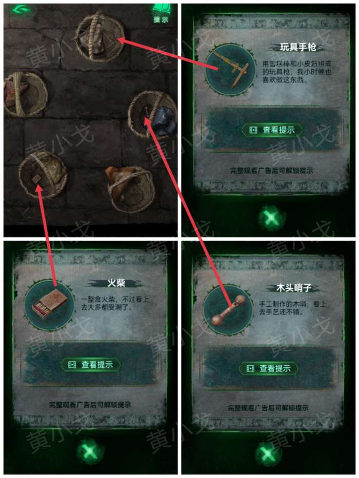 2.掀开包被,拾取篮子里的【火柴】、【木头哨子】和【玩具手枪】