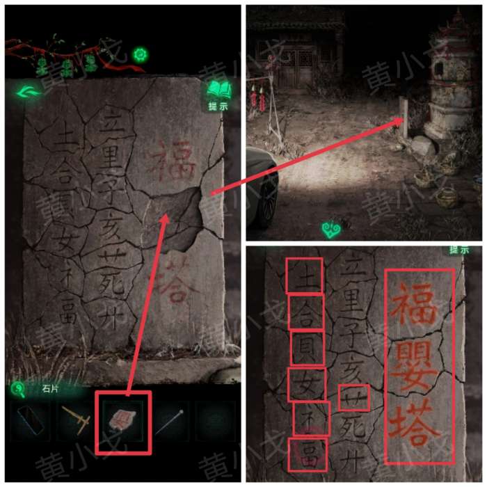11.点击石碑,放入【石片】;点击左侧石块,使其组成右侧石片上的字,打开学堂的门