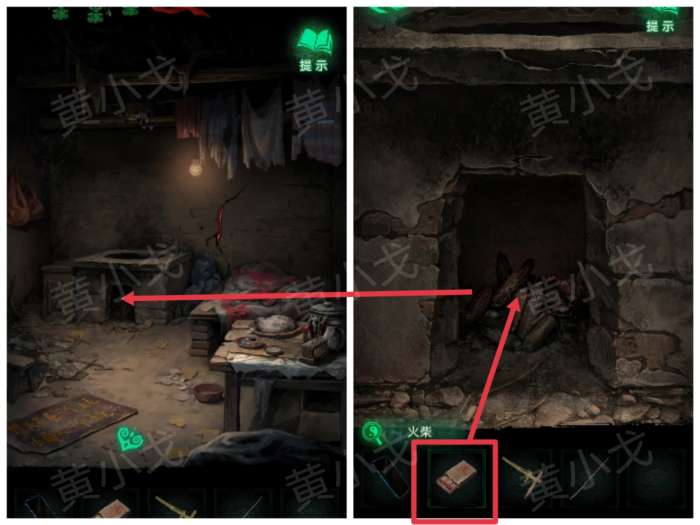 8.点击炉灶,用【火柴】点燃里面的干柴