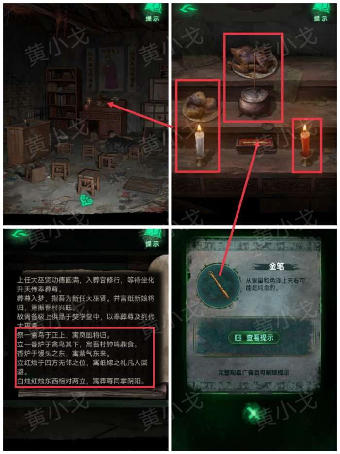 27.点击供桌,根据《账本》上的线索,正确摆放贡品的位置;打开暗格,获得【金笔】