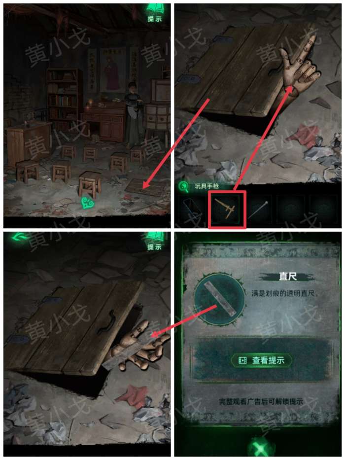 12.点击地下室的门,拉开,拿【玩具手枪】给人偶手,获得【直尺】