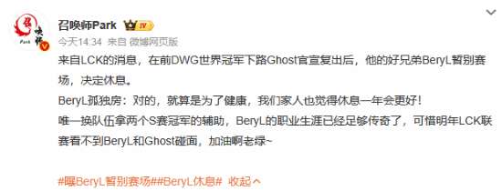 据《英雄联盟》资讯博主@召唤师Park爆料称,在前DWG世界冠军下路Ghost官宣复出后,他的好兄弟BeryL似乎短期内不会回归赛场,决定休息。