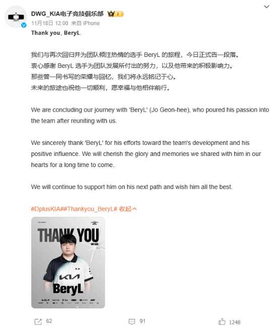 前一段时间,《英雄联盟》LCK战队DWG KIA官宣告别辅助选手BeryL。