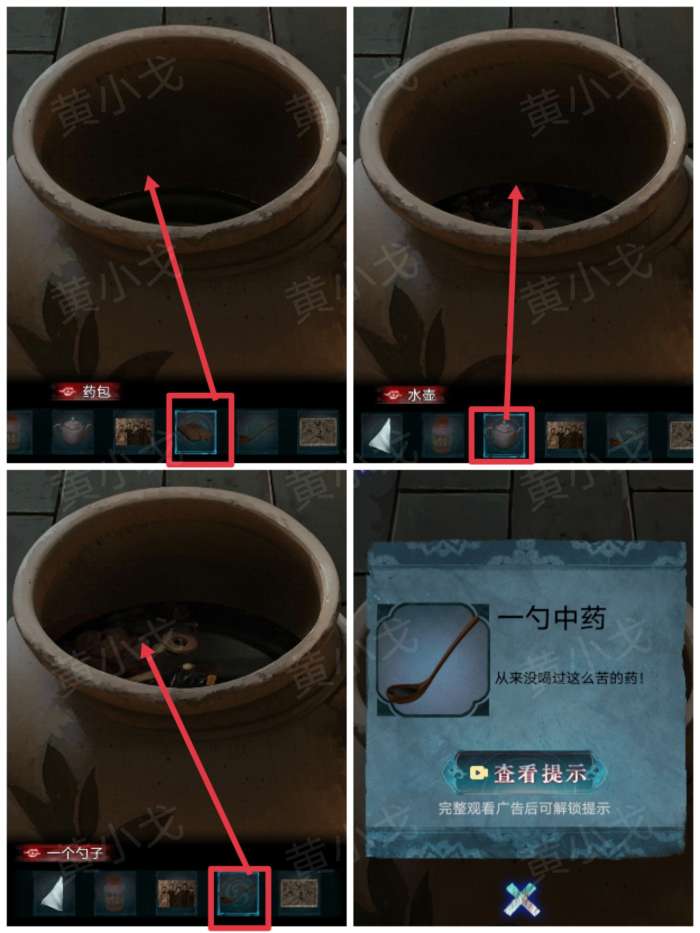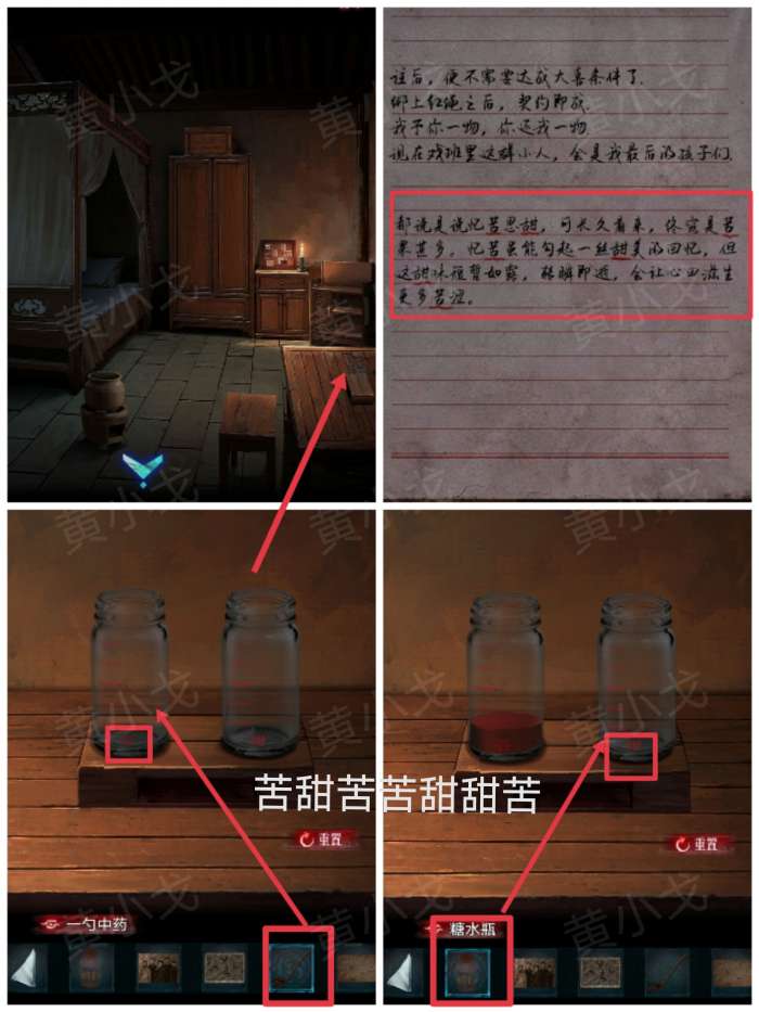 22.点击桌子上的瓶子,根据瓶子上的文字提示,结合纸条上画红线的字出现的顺序,按顺序倒入【一勺中药】和【糖水瓶】