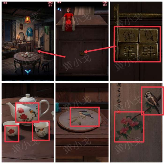9.点击柜子上的密码锁,根据上面的花鸟图案提示,结合茶具、扇子和屏风上的花鸟图案的数量,输入密码:柒肆
