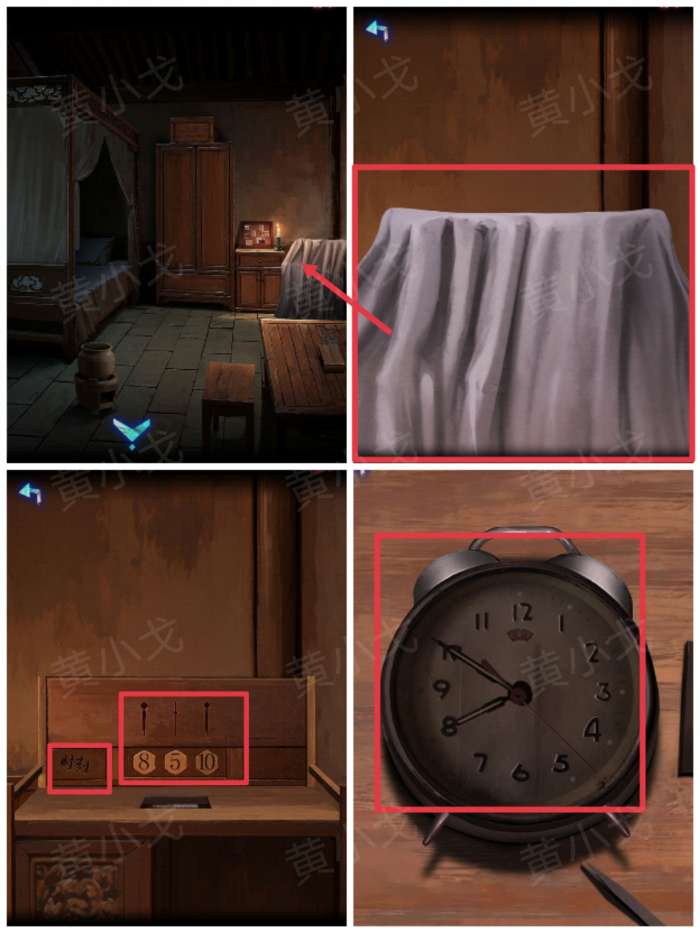 20.点击白布,拉开,根据上面的文字和指针形状提示,结合闹钟上的线索,调整对应按钮上的数字为:8、5、10