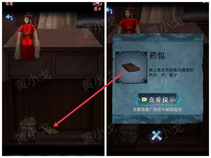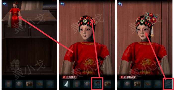 15.点击柜子上的人偶,给她戴上【红色绢花】,用【红颜料毛笔】给她上妆