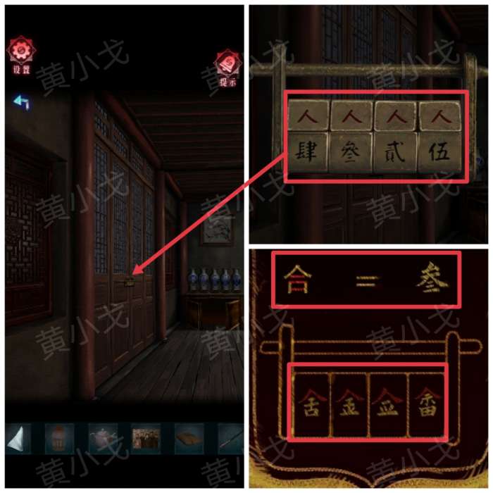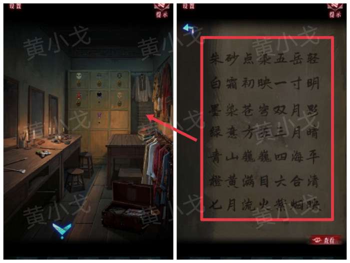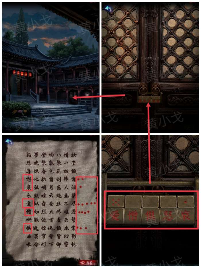 5.点击一楼厢房门上的密码锁,根据上面的红点数量提示,结合布上的线索,输入密码:爱憎惧怒哀