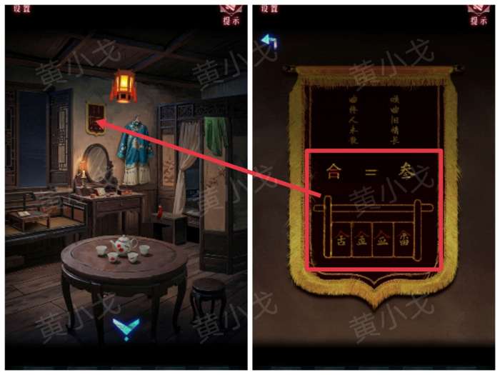 17.点击厢房门上的密码锁,根据上面的“人”字提示,结合锦旗上的线索,输入密码:肆叁贰伍