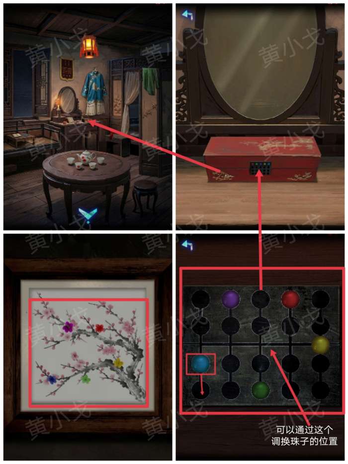 12.点击梳妆台上的盒子,根据走廊画上的线索,调整对应颜色珠子的位置