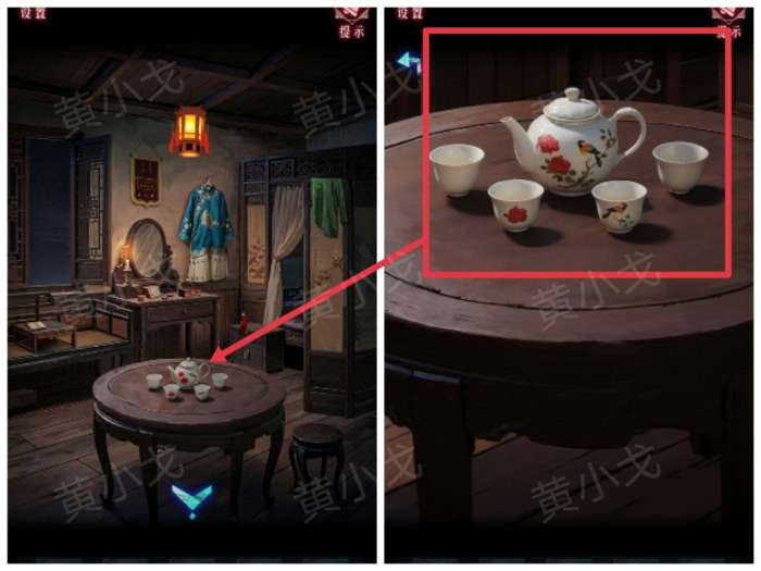 6.点击茶几上的茶具,注意茶具上印着的花鸟图案的数量