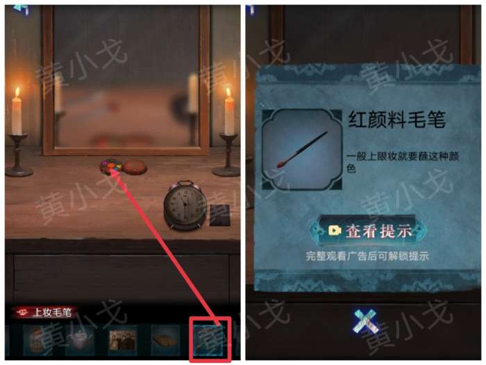 14.用【上妆毛笔】蘸取梳妆台上的颜料盒中的颜料,获得【红颜料毛笔】