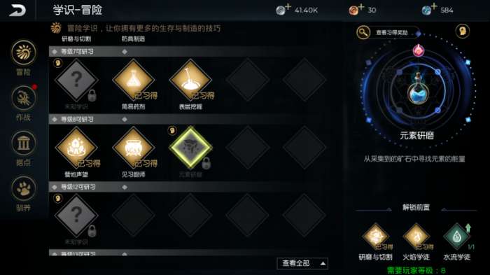冒险学识:提升探索与生存能力,例如解锁高级采集工具(如粗制铲)、生存技巧(如中级药剂制作)等。