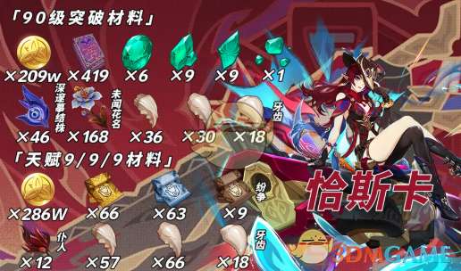 为方便统计,列出了恰斯卡突破到90级,三个技能升级到9/9/9所需的材料,具体需要多少材料可以由玩家的培养需求去灵活变化。