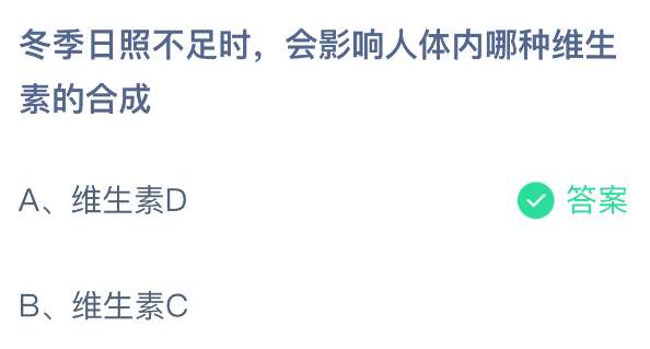 以上就是冬季日照不足时,会影响人体内哪种维生素的合成,支付宝蚂蚁庄园2026年1月13日答案最新,更多精彩内容,请点击关注pk游戏网更新!