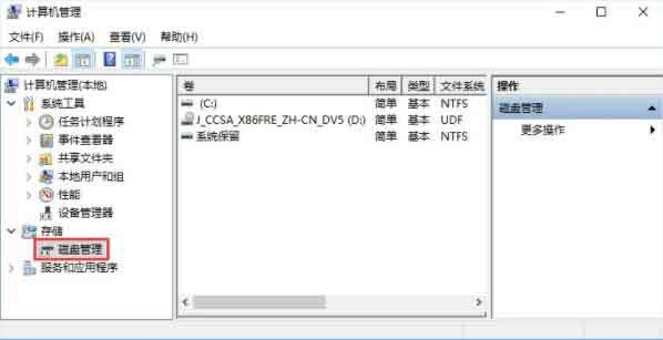 2、进入磁盘管理,在弹出来的窗口中,窗口左侧有一个树形框。点击这个树形框“储存”分类下的“磁盘管理”。进入磁盘管理界面。