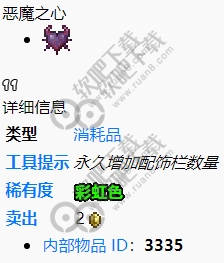 游戏中的恶魔之心可以永久地为玩家提供第六个饰品栏,不过该道具必须在专家模式的世界才能进行使用,在普通模式中是无法进行使用的,可以通过打败血肉墙掉落的宝藏袋中获取,恶魔之心的效果不会叠加,每个玩家只能使用一次,不在专家模式下时饰品栏将被禁用,移除任何饰品的效果和外观,并阻止新物品被放入饰品栏。