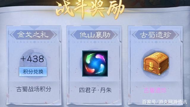 古蜀战场的竞技强度虽然很高,但是奖励也是颇为丰厚。战场积分,可以用于兑换门派、情义值、家园等各种积分。古蜀遗珍是本方排名前五玩家获得,打开就有各种道具奖励。
