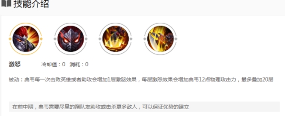 被动技能激怒:典韦每次拿到助攻或者敌方人头就能获得攻击加成,特别是叠满被动的情况下增加的攻击力,比现有的任何一件攻击装备增加的攻击力都高。使得典韦在不出输出装备时同样拥有一定的输出能力。