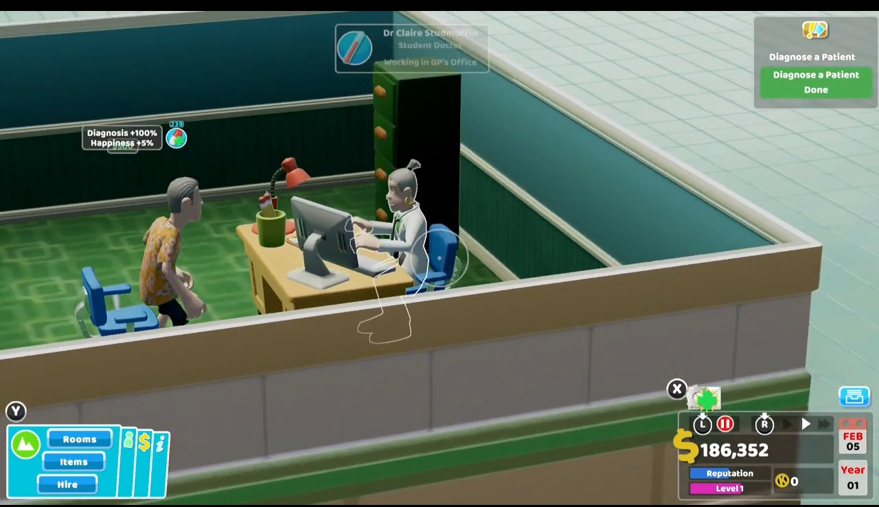 相较于键鼠操作的PC版,此类模拟经营最难攻克的移植难点就是主机手柄的适配。从视频中我们可以看到《双点医院》游戏进程中的建造、布局等还是相当流畅的,但是在游戏后期需要对多个人物/科室进行监督时可能会没有PC版那么行云流水。