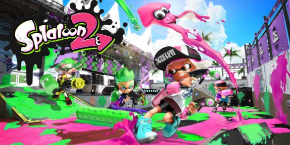 玩法简介:turf war 模式 4 v 4 线上射击对战,以喷墨总面积最大为积分方式面积大的队伍赢,角色可以变成墨鱼在自己颜色的墨里快速滑动躲避攻击、补充墨汁,被敌方墨击中、踩到会掉血。武器不限于枪,还有拖地油漆刷、毛笔刷子、撒墨桶、狙击等。不同武器大招不同。