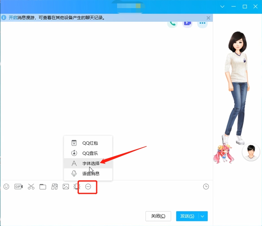 第一步:打开qq,随便点开一个对话框,点击下方的三个点标志,字体选择。