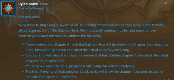 大家好,我们想向各位玩家们说明一下今天(6月4日)更新对“达拉然大劫案”2-5章产生的影响。我们现在正在积极地尝试修复,并有望在本周的晚些时候解决下列问题: