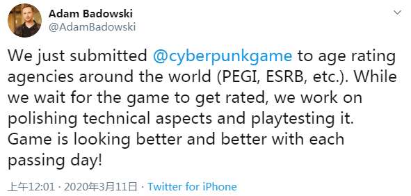 CDPR工作室总监Adam Badowski在推特上发文称,《赛博朋克2077》已经送往ESRB、PEGI等机构评级。在游戏发售之前,评级机构可能会透露更多关于该作的新细节。《赛博朋克2077》游戏里有成人场景和扶他等内容,评级机构应该会将该作评为PEGI 18和M级。