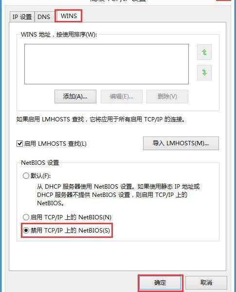 7、弹出“高级TCP/CP设置”对话框,切换至WINS选项卡,点击选中“禁用TCP/CP上的NetBIOS“单选按钮,然后点击“确定”即可。