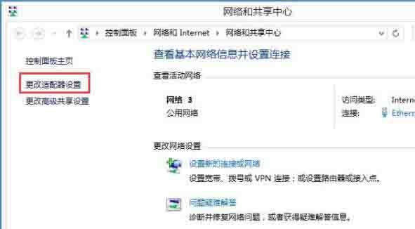2、打开“网络和共享中心”窗口,在左侧单击“更改适配器设置”;